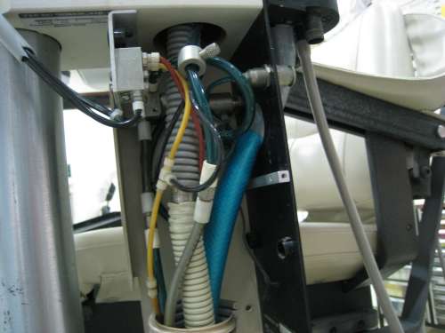ジョイントの下のベージュ色がドレインホース、ストレートの青色が